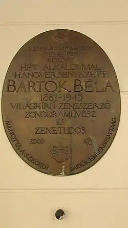Bereits 1935 wurde ihm die Ehrenmitgliedschaft der International Society for Contemporary Music ISCM gewährt.[20] Die ISCM-Weltmusiktage prägte er als Komponist nachhaltig. Nacheinander wurden dort 1923 die Sonate Nr. 2, 1925 die Tanzsuite, 1927 das 1. Klavierkonzert, 1934 die Rhapsodie Nr. 1, 1936 das 5. Streichquartett, 1938 die Sonate für 2 Klaviere und Schlagzeug, 1942 das Divertimento für Streichorchester, 1946 das Konzert für Orchester und 1957 wie 1965 Contrasts aufgeführt. Des Weiteren waltete Bartók bei den ISCM World Music Days 1924 als Juror und trat in den Festivals von 1927 und 1938 auch als Pianist auf.