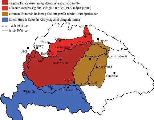 Die Ausrufung der Slowakischen Räterepublik am 16. Juni 1919 in Prešov und eine mögliche weitere Ausdehnung der „ungarischen Revolution“ hatten in der ersten Junihälfte 1919 diplomatische Noten der Ententemächte an die Ungarische Räteregierung zur Folge, in denen die sofortige Einstellung der Kampfhandlungen und der Rückzug der Roten Armee hinter die auf der Pariser Friedenskonferenz festgelegte Demarkationslinie gefordert wurden. Die Annahme dieser Forderungen und der Rückzug aus den kurz zuvor eroberten Gebieten wurde von den Soldaten und Offizieren der Roten Armee und auch in der Bevölkerung mit Verbitterung und Unverständnis aufgenommen und bewirkte letztlich eine irreparable Schädigung des Ansehens der Räteregierung. Dadurch wurden auch jene gegenrevolutionären Kräfte Ungarns begünstigt, die von Anfang an auf einen Sturz der Räterepublik hingearbeitet hatten. Als schließlich tschechische und rumänische Streitkräfte ihren Vormarsch wieder aufnahmen, kam die Räterepublik ins Wanken. Im Zuge des Ungarisch-Rumänischen Krieges stießen rumänische Truppen bis weit ins Innere Ungarns vor. Am 30. Juli 1919 überquerten diese die Theiß, und am 1. August 1919 kapitulierte die südliche Heeresgruppe der ungarischen Roten Armee nach Kämpfen bei Szolnok. Béla Kun ergriff die Flucht und setzte sich nach Österreich ab,[15] während die rumänische Armee Budapest besetzte und die Räteregierung gestürzt wurde.