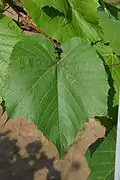 Die wechselständig angeordneten Laubblätter sind in Blattstiel und Blattspreite gegliedert. Bei jungen Laubblättern besitzen die Mittellappen der Blattspreiten lange Spitzen und sind gelbbräunlich-grün, schwach blasig, glänzend, an Oberseite spinnwebig, an der Unterseite dicht borstig behaart mit gelb-grünen, dicht kurzborstig behaarten Blattadern.[2] Beim relativ großen ausgewachsenen Laubblatt ist die dunkelgrüne Blattspreite breit keil- bis herzförmig, schwach dreilappig mit schwach ausgeprägten Buchten und u- bis lyra-förmiger Stielbucht; ihre Blattoberseite ist dunkel schwach glänzend. Die Basisblätter sind überlappend.[2]