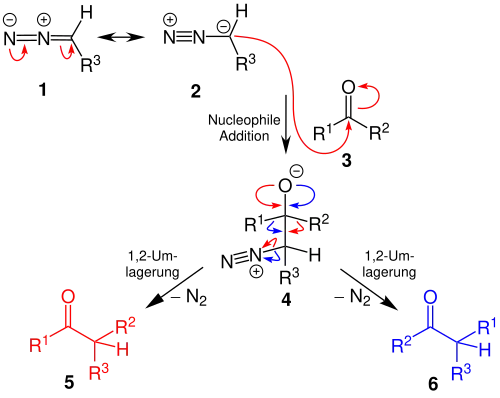 Die Diazoverbindung lässt sich in den Resonanzstrukturen 1 und 2 darstellen. Das freie Elektronenpaar am Kohlenstoffatom, welches neben dem Stickstoffatom in Verbindung 2 vorliegt, greift nucleophil an der Carbonylverbindung 3 an. Es bildet sich ein tetraedrisches Zwischenprodukt 4, welches sich unter Abspaltung von gasförmigem Stickstoff und einer 1,2-Umlagerung zu den Carbonylverbindungen 5 und/oder 6 zersetzt.[3][4]