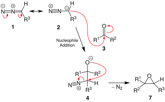 Der Reaktionsmechanismus zur Bildung des Epoxids 7 verläuft bis zur Bildung des tetraedrischen Zwischenprodukts 4 analog als nucleophile Addition.