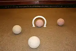 Als Spielmaterial werden vier Kugeln aus dem Kunststoff Aramith (früher aus Holz) benutzt, jede ist etwa 4 kg schwer und hat einen Durchmesser von ca. 18 cm. Die Kugeln werden mit Hilfe eines Schlägers oder einer Schüppe bewegt.