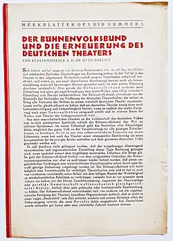 Die finanziellen Schwierigkeiten und Querelen in der Reichsgeschäftsstelle Ende der 1920er Jahre führten zu einer teilweisen Verselbständigung der Landesverbände.[13] In der politischen Konfliktlage geriet der BVB zunehmend ins Visier der erstarkenden NSDAP. Diese hatte auf dem 3. Reichsparteitag im August 1927 „kulturelle Richtlinien zur Gewinnung der geistig Schaffenden“ beschlossen und Anfang 1928 die „Nationalsozialistische Gesellschaft für deutsche Kultur“ (NGDK) gegründet, kurz darauf umbenannt in Kampfbund für deutsche Kultur (KfdK)[14]. Dessen Theatersektion bezeichnete sich als „Nationaler Bühnenvolksbund“[15] und versuchte, Personen, Mitglieder und ganze Ortsausschüsse des BVB abzuwerben. Bis zu einem gewissen Grade bemühte sich der BVB Anfang der 1930er Jahre um einen Ausgleich und um Fürsprecher bei den rechtsnationalen Kräften, etwa indem stark vergünstigte Theatervorstellungen an Organisationen wie den Stahlhelm, Bund der Frontsoldaten, vermittelt wurden.