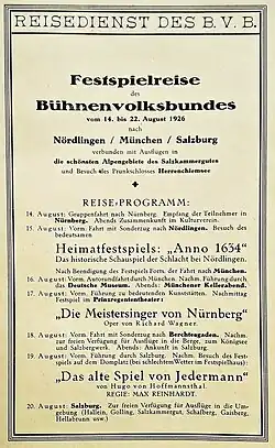 Im „Spielplan des Kulturtheaters“ fanden sich gleichwohl Dramatikernamen wie Goethe, Schiller, Shakespeare, Molière, Ford, Marlowe, Tolstoi und Tschechow. Mit besonderem Nachdruck allerdings Mysterien-, Passions- und Osterspiele oder kirchliches Welttheater im Stile Calderons und Lope de Vegas. Im Jahre 1928 standen in den Programmen der Wanderbühnen auch Stücke von Lessing, Eichendorff, Benedix, Kleist, Hebbel, Goldoni, Max Mell, Ibsen, Strindberg, Shaw und Hauptmann.[18] Zwar versuchte der BVB immer wieder, die Theater zur Aufnahme christlicher Stoffe zu bewegen, doch stießen diese nicht immer auf ausreichenden Zuspruch eines zahlenden Publikums.