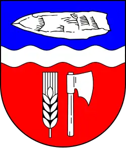 Blasonierung: „Durch einen erhöhten silbernen Wellenbalken von Rot und Blau geteilt. Oben eine liegende silberne Flintbeilschneide, unten eine aufrechte silberne Ähre neben einem auswärts gewendeten, aufrechten silbernen Schlachterbeil.“[3]