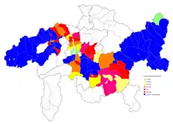 Auf lokaler Ebene regelt jede Gemeinde in ihrer Verfassung und in ihren Gesetzen, welche Sprache bzw. welches Idiom Amts- und/oder Schulsprache ist. Gemäss Artikel 16 des Bündner Sprachengesetzes gelten Gemeinden, in denen mindestens 40 % der Einwohner das angestammte Idiom sprechen, als amtlich einsprachig, und Gemeinden, in denen wenigstens 20 Prozent das angestammte Idiom sprechen, als amtlich zweisprachig.[22] Die Gemeinden haben auch die Möglichkeit, anstelle eines speziellen Idioms Rumantsch Grischun als Amtssprache zu bezeichnen.