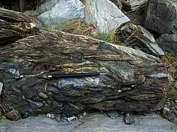 Die Bündnerschiefer sind kalkig-tonige Sedimente der Alpen, die während des Jura und der unteren Kreidezeit im penninischen Walliser Trog, einem Meeresbecken mittlerer Tiefe, und im ozeanischen Bereich der alpinen Tethys abgelagert worden sind. Aufgrund späterer alpiner Metamorphose handelt es sich dabei heute um Kalk-, Ton-, Glimmer- oder Kalkglimmerschiefer.[1] Der Name leitet sich vom Schweizer Kanton Graubünden ab, in dem sie besonders häufig sind. In Frankreich werden sie als Schistes lustrés (Glanzschiefer) bezeichnet,[2] in Italien sind sie ein Teil der begrifflich weiter gefassten calcescisti, wie sie auch im Apennin vorkommen.[3] Abgelagert wurden die Bündnerschiefer im Penninischen Ozean, der sich zwischen dem Südrand der Eurasischen und Apulischen Platte befand und bei der alpinen Gebirgsbildung geschlossen wurde.