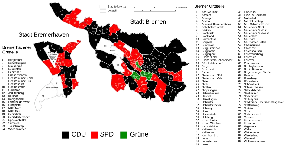 - ↑ Bürgerschaftswahl 'Land Bremen' - Gesamtergebnis. Abgerufen am 12. Juni 2019.