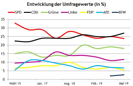 | Infratest dimap[8] | 16.05.2019 | 24 % | 27 % | 18 % | 12 % | 5 % | 6 % | 3 % | 5 % |