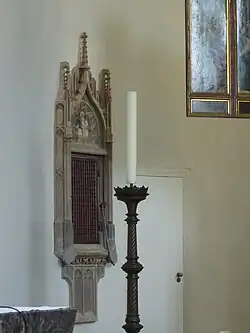 Die Kirche ist ein einschiffiger romanischer Bau der nach 1234 entstand.[5] Sie besteht aus einem etwa 36 m langen und fast 10 m breiten Saal und quadratischem Westturm. An der Nordseite des Chores befindet sich ein vorzüglich erhaltenes Sakramentshäuschen in Stein mit Stifterwappen und der Datierung 1453.