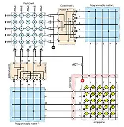 Ihm gelang es innerhalb der gesetzten Frist, auf Basis der Damm’schen Rotor-Chiffriermaschine aus dem Jahr 1919, insbesondere derer „vereinfachten Durchgangsräder“, ein Mustergerät herzustellen. Seine Maschine verfügte über eine Tastatur mit 25 Buchstaben, zwei Durchgangsrädern (ähnlich den Enigma-Walzen), deren Fortschalten jedoch – anders als bei der Enigma – durch jeweils zwei weitere Schlüsselräder mit unterschiedlicher Teilung (17, 19, 21, 23) gesteuert wurde, und einem Lampenfeld zur Anzeige. Wie die Tastatur verfügte auch das Lampenfeld nur über 25 Buchstaben. Hagelin verzichtete gegenüber den üblichen 26 Großbuchstaben des lateinischen Alphabets auf den im Schwedischen selten verwendeten Buchstaben W. Dieser konnte im Bedarfsfall durch V V ersetzt werden. Ferner verzichtete er auf Umlaute (Ä und Ö) und auf den Buchstaben Å. Grund für diese Reduzierung auf nur 25 Buchstaben war, dass er so als zentrales Element eine Schaltmatrix aus 5 × 5 Zeilen und Spalten verwenden konnte (siehe auch: Stromlauf der B‑21 unter Weblinks).[2]