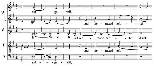 Das Motiv ist an dieser Stelle bei weitem nicht so gut hörbar wie im letzten Satz, weil zwei Töne (für die Buchstaben A und H) nur eine kurze Achtelnote einnehmen und alle vier Stimmen gleichzeitig erklingen.
