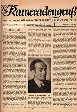 Ebenfalls Anfang 1946 wurde in Bad Homburg die „Vereinigung Hirnverletzter in Hessen (Selbsthilfe-Organisation der Gehirn- und Rückenmarksverletzten)“ gegründet. In Folge des Organisationsverbots des Kontrollrats vom 30. November 1945 lösten die amerikanischen Behörden die Organisationen in Bayern und Hessen aber wieder auf. Am 29. April 1948 schlossen sich die Verbände der britischen und amerikanischen Zone in Herne zusammen, der Name „Bund hirnverletzter Kriegs- und Arbeitsopfer“ blieb bestehen. Bereits im Herbst 1948 berief der „Bund“ einen wissenschaftlichen Beirat, den eine ganze Reihe von Autoritäten auf dem Gebiet der ärztlichen Hirnverletzten-Betreuung angehörte. Gegen Ende der 1940er Jahre hatte sich der „Bund hirnverletzter Kriegs- und Arbeitsopfer“ erfolgreich rekonstituiert, die Gliederung in Bundesverband, Landesverbände, Kreis- und Ortsverbände war vollzogen und sollte für weit über ein halbes Jahrhundert bestehen bleiben. Die Struktur war föderal angelegt, die Landesverbände wählten komplette Vorstände und hielten eigene Tagungen ab. Hatte es seit 1947 immerhin gedruckte Merkblätter gegeben, so erschien am 1. Januar 1949 das Verbandsorgan „Kameradengruß“ zum ersten Mal.[13]