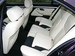 - M Sportpaket: Es wurde ab Frühjahr 1999 für die Limousine[31] sowie ab Frühjahr 2001 für den Touring[25] angeboten. Zur Exterieur-Ausstattung gehören das M Aerodynamikpaket, die M Leichtmetallräder 17″ Parallelspeiche 66, Nebelscheinwerfer, weiße Blinkleuchten, das M Sportfahrwerk II (nur für die Limousine) oder eine sportliche Fahrwerksabstimmung mit Niveauregulierung (nur für den Touring), eine Shadow Line (nur für Sechszylinder) oder Hochglanz Shadow Line (nur für Achtzylinder), schwarze Stoßleisten und ein verchromtes Auspuffendrohr (nur für Benziner). Zur Interieur-Ausstattung gehören Sportsitze für Fahrer und Beifahrer, die Polsterung Stoff M Flachgewebe/Alcantara in anthrazit, das M Lederlenkrad (für Achtzylinder mit Multifunktion), Interieurleisten mattchrom (für Sechszylinder, wahlweise ohne Aufpreis für Achtzylinder) oder in der Edelholzausführung Nussbaumwurzel (nur für Achtzylinder), der Dachhimmel in anthrazit, die M Aluminiumfußstütze und Einstiegsleisten mit M-Emblem.[21][37] Das M Sportpaket bietet bei der Limousine an der Vorder- und Hinterachse um ca. 50 Prozent höhere Abtriebswerte.[31] Im September 2001 wurde das M Sportpaket durch die Edition Sport ersetzt, in welcher der Ausstattungsumfang des M Sportpaket vollständig enthalten ist.[30]