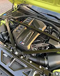 Die Grundkonstruktion des Motors gleicht der des BMW B58 mit Closed-Deck-Motorblock und direkt auf die Aluminiumzylinder lichtbogendrahtgespritzten Stahllaufbahnen (LDS) zum Verringern von Reibung,[11] er ist jedoch (mit 90 mm Hub um 4,6 mm) kurzhubiger ausgelegt als der schwächere B58-Motor und hat anstelle eines Twin Scroll-Turboladers zwei einzelne Abgasturbolader; sie sind kleiner als der Twin-Scroll-Lader und reagieren dadurch schneller auf weniger Abgas bei niedrigen Drehzahlen/Lastwechsel. Die Maximaldrehzahl des Motors beträgt 7200/min. Die geschmiedete Kurbelwelle ist leichter als die des B58.[12] Der Druck der Benzindirekteinspritzung konnte wie beim B58 ab 2018 von 200 auf 350 bar angehoben werden. Für den Guss der aufwendigen Form der Kühlkanäle im Zylinderkopf werden 3-D-gedruckte Sandkerne verwendet. Für die Kühlung gibt es einen zentralen und zwei seitliche Kühler. Bei den Modellen M3/M4 sind diese in den Radhäusern eingebaut.[2]