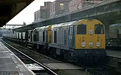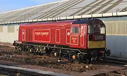 - 20/9: Sechs Lokomotiven mit den Nummern 20 901 bis 20 906, die 1989 von Hunslet-Barclay gekauft und in Kilmarnock aufgearbeitet wurden. Die Höchstgeschwindigkeit wurde auf 100 km/h (60 mph) herabgesetzt, die Vakuumbremse entfernt.[12] Die Lokomotiven wurden für Unkrautbekämpfungszüge eingesetzt[15] und machten die Klasse 20 zur ersten Baureihe von Lokomotiven im Privatbesitz, die auf dem öffentlichen Streckennetz verkehren durften.[9] Die Lokomotiven wurden Anfang 1999 an DRS verkauft, zwei gelangten über Harry Needle Railroad Company (HNRC) im Januar 2024 in den Besitz des Bauunternehmens Balfour Beatty, das die Lokomotiven zusammen mit einem Kanalreingiungszug verwendet.[16]