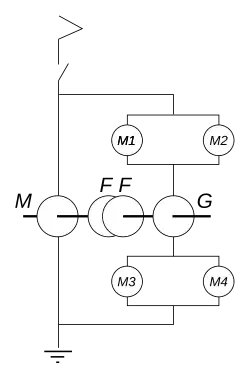 Der Motor des Umformers ist direkt mit der Fahrleitungsspannung verbunden, während der Generator in Reihe zwischen die beiden Fahrmotorgruppen geschaltet ist, wobei eine Gruppe mit der Fahrleitung und die andere mit der Schiene verbunden ist. Innerhalb einer Fahrmotorgruppe sind die beiden Fahrmotoren parallel geschaltet.[7] Der Energiefluss im Umformer wird über die Erregerwicklungen des Generators gesteuert. Der Generator des Umformersatzes hat eine Leistung von 945 kW bei 1750 Umdrehungen pro Minute. Der Motor hat bei einer Spannung von 675 V eine Leistung von 1000 kW. Zwei Schwungräder auf der Welle der Umformergruppe halten diese auch bei kurzen Spannungsunterbrechungen, wie sie beim Befahren von Bahnübergängen auftreten, in Betrieb.[8]