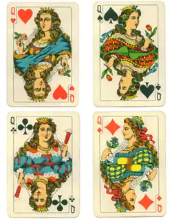![]() Pik-Dame ![]() Kreuz-Dame Die Spieler mit den beiden schwarzen Damen bilden ein Team, die Alten |