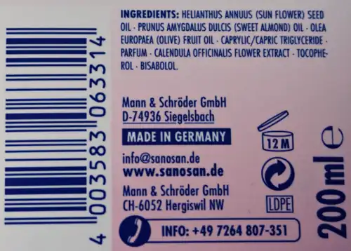 INCI-konforme Angabe der Inhaltsstoffe eines pflanzenölbasierten Babyöls auf der Rückseite der Packung unten.