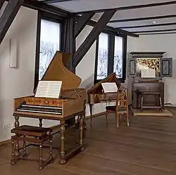 Seit 1973 werden Tasteninstrumente in einem kleinen, ca. 20-minütigen Konzert stündlich den Besuchern vorgeführt.[39] Zu den heute vorgeführten Instrumenten zählen zwei Orgelpositive (Schweiz, ca. 1750[40] und Thüringen, ca. 1650), ein gebundenes Clavichord (um 1770),[41] ein Spinett (Johann Heinrich Silbermann (ein Neffe von Bachs Freund Gottfried Silbermann), Straßburg, 1765)[42] und die Kopie eines Cembalos von Johann Heinrich Harrass (Breitenbach/Thüringen, 1705). Die Orgeln werden nicht elektrisch betrieben. Während das Schweizer Orgelpositiv vom Spieler mittels eines Trethebels mit Wind versorgt wird, muss sich beim Thüringer Orgelpositiv immer ein Besucher bereitfinden, den Balg zu treten. Dieses Instrument ist das älteste bekannte erhaltene thüringische Orgelpositiv und hatte ab 1714 als Kirchenorgel in Kleinschwabhausen gedient; damals war Bach Hoforganist im 15 Kilometer entfernten Weimar. Der mit Bach befreundete Hoforgelmacher Heinrich Nicolaus Trebs setzte die Orgel 1724 und 1740 instand. Bachs Schüler und Nachfolger als Hoforganist Johann Caspar Vogler prüfte sie 1738, 1740 und 1744. Im Museum wird daher vermutet, dass Bach das Instrument ebenfalls kannte.[43]