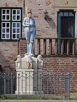 Bis zum Ende des 16. Jahrhunderts setzte der Rat der Stadt Bremen bremische Bürger gegen eine Pachtsumme als Amtmänner in Bederkesa ein. Danach übernahm die Stadt die Herrschaft in eigener Regie. Als Zeichen der Gerichtshoheit ließ Bremen 1602 den Roland im Burghof errichten. Die Wappenschilde der den Roland begleitenden Figuren erinnern an Bremer Ratsfamilien, die hier als Amtleute tätig waren. Der liegende Schlüssel im Wappen von Bederkesa erinnert an die Zeit der bremischen Herrschaft im Amte.