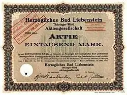 Kaiser Wilhelm II. verlieh Liebenstein 1907 den Zusatz Bad, und Maximilian Graf von Wiser wurde Leiter der neuen Augenheilanstalt. 1917 wandelten die Besitzer den Badebetrieb in eine Aktiengesellschaft um und firmierten fortan unter dem Namen Herzogliches Bad Liebenstein Thüringer Wald Aktiengesellschaft, aber erst acht Jahre später kam die Aktiengesellschaft in ruhiges Fahrwasser. Die Aktienmajorität ging an Fritz Lauterbach, der das Bad bis zu seiner Enteignung im Jahr 1947 führte. Im Jahr 1923 gab es den ersten Gemeindeverbund, bestehend aus den Ortsteilen Bad Liebenstein, Schweina und Steinbach, welcher schon nach kurzer Zeit scheiterte. In den 1930er Jahren entstand das Stadtviertel Siedlung.