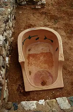 Im 5. Jahrhundert v. Chr. entstanden öffentliche Badeanstalten mit einem Becken und Wannen sowie einem Salbraum (altgriechisch βαλανεῖον balaneion „Badstube“ bzw. λουτρόν loutron „Bad“). Ab dem 4. Jahrhundert wurden öffentliche Bäder zu einer verbreiteten Einrichtung in griechischen Städten. Ein bestimmtes Bauschema scheint es nicht gegeben zu haben, man findet Räume mit meist 10 bis 22 Wannen oder Sitzwannen sowohl in rechteckiger (zum Beispiel in Olympia) als auch kreisbogenförmiger Anordnung (zum Beispiel in Gortyn, Gela und Megara Hyblaea). Teilweise gab es in einem Badekomplex zwei Baderäume, in denen Männer und Frauen getrennt baden konnten. Neben diesen öffentlichen Bädern gab es auch in Privathäusern bereits Badezimmer. Häufig enthielten sie nur ein Waschbecken in Hüfthöhe. Einige enthielten auch bereits aus Ton gebrannte Badewannen, wie man sie beispielsweise in Olynth ausgegraben hat.[2] Zur weiteren Reinigung kannten die Griechen Schwitzbäder (Dampfbäder), in denen heiße Steine mit Wasser übergossen wurden. Es gab außerdem trockene Heißluftbäder. Das waren kleine Räume, in denen ein Becken mit Holzkohle für Hitze sorgte. 300 Jahre später wurde das so genannte Hypokaustum zur Beheizung der Badeanlagen eingeführt.