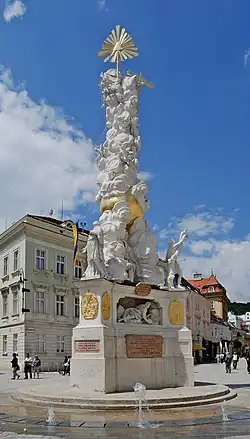 2. Am 8. Juli 1713 beschloss der Stadtrat von Baden, aus Anlass der überwundenen Pestepidemie eine Säule zu Ehren der heiligsten Dreifaltigkeit auf dem Hauptplatz zu errichten. Am 3. Juni 1714 erfolgte die Grundsteinlegung, am 12. Juni 1718 die Weihe durch den Heiligenkreuzer Abt Gerhard Weixelberger. Die Säule wurde in den Jahren 1756, 1833, 1844, 1884, 1932, 1961 und 1980 restauriert. (Ressel: Kirchen und Kapellen, S. 137)