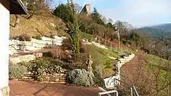 Badenweiler von der Ruine Burg Baden aus, mit evangelischer Kirche und Teil des Hotels Römerbad rechts unten.