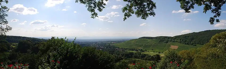 Blick vom Vogesenblick an der Nordwestecke des Burgbergs der Burg Baden: Vogesen (Frankreich) auf der West-Seite der Rheinebene, Stadt Müllheim mit Teilort Niederweiler sowie Innerberg (rechts) und Ölberg (links)