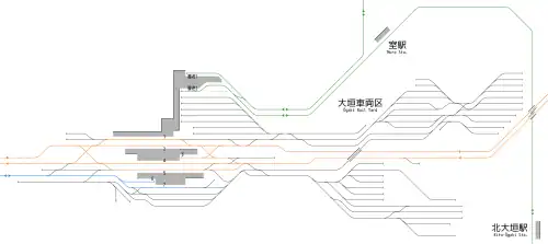 Die Yōrō Tetsudō verfügt über ein eigenes ebenerdiges Bahnhofsgebäude, das an die Südwestecke des JR-East-Empfangsgebäudes angebaut ist. Es besitzt einen überdachten Mittelbahnsteig mit zwei Stumpfgleisen, die an einem Querbahnsteig enden. Aufgrund einer fehlenden Weiche kann Gleis 1 nur von Zügen aus Richtung Kuwana befahren werden, während Gleis 2 sowohl von Kuwana als auch von Ibi her erreichbar ist. Der Fahrplan ist so gestaltet, dass zwischen beiden Teilstrecken der Yōrō-Linie zwingend umgestiegen werden muss; es gibt keine durchgehenden Verbindungen.[6] Zwischen den Gleisen der Yōrō Tetsudō und den Durchgangsgleisen von JR East liegt eine Abstellanlage mit sieben Stumpfgleisen.