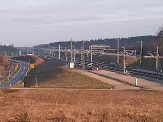 Aufgrund weniger Siedlungsbereiche wurde im Raumordnungsverfahren der Neubaustrecke eine Führung westlich der Autobahn favorisiert.[13]