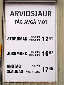 Das Bahnhofsgebäude ist im Obergeschoss bewohnt, im Untergeschoss befinden sich der Warteraum und die Diensträume für den Fahrdienstleiter. Außen am Bahnhof ist eine etwa zwei Meter hohe Bahnhofstafel, die die Personenzugfahrten anzeigt, angebracht. Aktuell sind hier nur drei Fahrzeiten aufgelistet: Der südgehende Triebwagen der Inlandsbanan AB nach Storuman (– Östersund), der nordgehende nach Jokkmokk (– Gällivare) sowie der Dampfzug des Arvidsjaurs Järnvägsförening nach Slagnäs.
