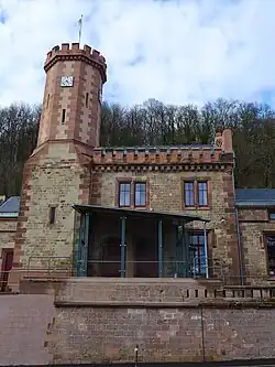 Schießschartenartige Fensterschlitze am markanten, 20 m hohen Turm, die als Zinnenkranz gestalteten Gesimse, gotische Bögen und das rustikale Sandsteingemäuer lassen den Gebäudekomplex von seiner äußeren Gestalt an eine mittelalterliche Burganlage erinnern. Die benachbarte Ruine der Siersburg auf der gegenüberliegenden Saarseite sowie andere Saarburgen könnten als architektonische Inspirationsquelle gedient haben.