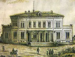 Das Empfangsgebäude wurde 1845 nach Plänen Georg Mollers im Stil des Klassizismus stadtseitig (östlich der Bahnstrecke) errichtet. Die zweifarbige Fassade des zweigeschossigen, unterkellerten Sandsteingebäudes war mit neun Fensterachsen gegliedert, mit einer zentralen Fünfergruppe. Um 1900 wurde die Straßenfront durch zwei an den Seiten symmetrisch angeordnete und als Oktogonalpavillons gestaltete Vorbauten und weitere seitliche Anbauten umgestaltet. Die Traufe des flachen Walmdaches ist durch einen umlaufenden Volutenfries geschmückt.[8]