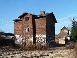 Der ursprüngliche Bahnhof lag südlich der Bahnhofstraße, die die Bahngleise ebenerdig kreuzte. Von dieser Station blieb lange Zeit ein Bahnwärterhaus mit Stallgebäude östlich der Gleisanlagen erhalten. Die beiden leerstehende Gebäude wurden unter Denkmalschutz gestellt,[5] sind jedoch in der Denkmalliste 2014 nicht mehr enthalten und wurden im gleichen Jahr abgerissen.
