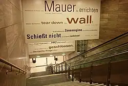 Lange Zeit war die Gestaltung des Bahnhofs aufgrund der angespannten Finanzlage des Landes Berlin unklar. Letztlich wurde der Bahnhof mit in das Gedenkstättenkonzept der Hauptstadt aufgenommen: Im und am Bahnhof wird an die Teilung Berlins erinnert, ein Informationszentrum und verschiedene große Karten informieren die Fahrgäste. Den Bahnhof selbst hat das Büro Oestreich/Hentschel anthrazitfarben gestaltet und mit besonders leuchtkräftigen Deckenlichtern erhellt. Der Bahnsteig mit einer doppelten Stützenreihe ist 110 Meter lang und am westlichen Ende mit einem Aufzug ausgestattet.[7]