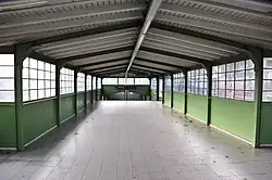 Im Jahr 1935 wurde zur besseren Anbindung des Messegeländes sowie der neu errichteten Deutschlandhalle der zweite Ausgang in Verlängerung der Fußgängerbrücke eröffnet. Der Entwurf von Fritz Hane und Hugo Röttcher orientierte sich an der bereits bestehenden Anlage,[3] verzichtete aber auf ein Empfangsgebäude. Der Zugangsbau wies lediglich eine schlichte Halle mit Fahrkartenschaltern und Passimetern auf.[4] Am 15. Mai 1936 erfolgte die Umbenennung des Haltepunkts in Deutschlandhalle.[5]