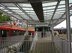 Der Umsteigepunkt zwischen Straßenbahn und S-Bahnhof besteht aus drei Zu- bzw. Abgängen und zwar von jeder Fußgängerseite der Brücke und einem direkten Zu-/Abgang von der Haltestelleninsel. Dieser Gang war bis zum Februar 2022 nur über eine Treppe nutzbar. Die BVG als verantwortliche Betreiberin der Straßenbahn hat im Februar 2022 eine Aufzugsanlage in Betrieb genommen, die die Mittelbahnsteige der Straßenbahn mit der Fußgängerunterführung zum S-Bahnsteig verbindet und nun barrierefrei nutzbar ist. Der Bau des Aufzugs dauerte zwölf Jahre und kostete 2,3 Millionen Euro. Im Anschluss an die Inbetriebnahme des Aufzugs, kam es bis Ende 2022 zur erneuten Sperrung des Aufzugs, im Kontext der Sanierung des Fußgängertunnels.[4]
