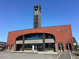 Der Bahnhof liegt östlich des Stadtzentrums und ist von Süden nach Norden ausgerichtet. Er besitzt zwei Gleise, die beide dem Personenverkehr dienen. Sie liegen am Hausbahnsteig und an einem teilweise überdachten Seitenbahnsteig, der durch eine gedeckte Überführung mit dem Empfangsgebäude an der Westseite der Anlage verbunden ist. Auffälliges Merkmal des Gebäudes ist ein Uhrturm, dessen Glocke jeweils bei der Ankunft des Super Sōya läutet. An der Straße vor dem Bahnhof befindet sich eine Bushaltestelle, die von der Gesellschaft Meishi Bus bedient wird.