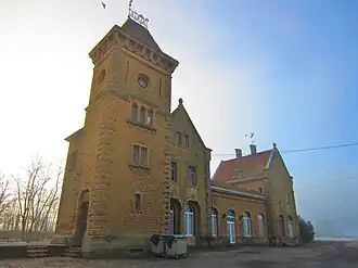 Das Empfangsgebäude von 1873 war ein Typenbahnhof[4], wenn auch als Grenzbahnhof viel größer angelegt, als es der Bedeutung der Gemeinde entsprach. Hier war auch der Zoll unterzubringen und zusätzliches Bahnpersonal. Zudem wurde es als „Eintrittstor“ von Frankreich ins Deutsche Reich besonders repräsentativ gestaltet, war zehnachsig, erhielt eine Bahnsteighalle und einen Uhrturm mit Bossenwerk an den Ecken. Der Uhrturm bildete zugleich die Blickachse für die aus dem Ort auf den Bahnhof zulaufende Straße. Das Gebäude wurde im Ersten Weltkrieg schwer beschädigt, aber in den 1920er Jahren vereinfacht wieder aufgebaut.[5]