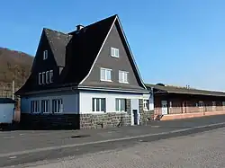Der Bahnhof ist in zwei Bahnhofsteile unterteilt: der Personenbahnhof und südlich angrenzend der Güterbahnhof. Das Gebäude des Güterbahnhofs von 1916 besteht zum einen aus einem villenartigen Gebäude für die Verwaltung mit einem sehr großen Dach. Das Dach ist zweistöckig und überragt den einstöckigen Baukörper dominant. Zum anderen besteht das Gebäude aus der an diesen Verwaltungsbau angefügten Güterhalle. Es steht unter Denkmalschutz.[3]