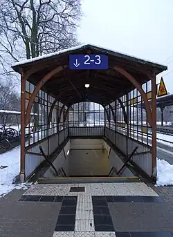 Vom Zugang südlich des Empfangsgebäudes führt eine Unterführung, die nur über Treppen zugänglich ist, auf den Mittelbahnsteig. Die Unterführung ist auf der Seite des Hausbahnsteigs mit einem Treppenpavillon aus Glas und Stahl im Art-déco-Stil wettergeschützt. Die Bahnsteigüberdachung auf einer stählernen Säulenreihe[7] stammt vermutlich aus den 1930er Jahren.