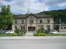 Der Bahnhof liegt in Hochlage ca. 4 Meter über dem Straßenniveau. Hinter einer Stützmauer befindet sich der mit einem Flugdach überdachte Bahnhofsvorplatz. Auf diesem gibt es einen Warteraum sowie eine öffentliche WC-Anlage. Weiters sind dort Park-and-Ride-Plätze vorhanden und es halten die Regiobusse der Linien 100 und 216. Der Haupteingang führt vom Vorplatz direkt in den Personentunnel, von dem aus der 210 Meter lange Mittelbahnsteig 1–2 und der 160 Meter lange Randbahnsteig 3 jeweils über feste Stiegen und Aufzüge erreichbar sind. Hinter Bahnsteig 3 befinden sich zwei Parkplätze, wovon der südliche vom Bahnsteig aus ebenerdig und der nördliche mittels einer Treppe und einer Rampe erreichbar ist. Südlich des Personenbahnhofes befinden sich Gütergleise, auf denen Wagen zur Belieferung der Kartonfabrik Mayr-Melnhof, welche über einen eigenen Gleisanschluss verfügt, abgestellt sowie be- und entladen werden. Zum Verschub kommt eine Lokomotive der Baureihe 2016 zum Einsatz.