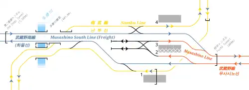 Der Bahnhof liegt im östlichen Bereich des Stadtteils Honmachi. Er ist von Süden nach Norden ausgerichtet und besitzt sechs Gleise, von denen vier dem Personenverkehr dienen. Züge der Nambu-Linie nutzen die beiden äußersten Gleise und halten an Seitenbahnsteigen, während Züge der Musashino-Linie zwei Stumpfgleise an einem Mittelbahnsteig nutzen. Je ein Gleis zwischen der Nambu- und der Musashino-Linie ist dem Güterverkehr vorbehalten. Das Empfangsgebäude besitzt die Form eines Reiterbahnhofs, der sich zusammen mit dem Bahnhofsvorplatz quer über die gesamte Anlage spannt. Gegenüber den gewöhnlichen Bahnsteigsperren steht eine zweite, bedeutend größere Anlage dieser Art, die nur während der Renntage auf der nahe gelegenen Pferderennbahn Tokio verwendet wird.[2]