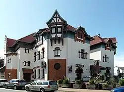 Das Gebäude ist ein zweigeschossiger Putzbau mit Ziegelgliederung und Drempel in Fachwerk. Durch seine Lage und Gestaltung ist es prägend für das Stadtbild.
