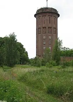 Ein ehemaliger, ca. 33 Meter hoher Bahnwasserturm befindet sich nahe dem Bahnhofsgebäude. Der elfgeschossige, expressionistisch gestaltete Backsteinbau wurde 1926 errichtet. Unter dem Wasserbehälter sind Wohnungen für Eisenbahner mit konischen Zimmern eingebaut worden.[13] Er befindet sich ebenfalls in stark verfallenem Zustand und ist denkmalgeschützt.[14]