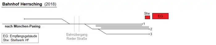 Von März 2013 bis Oktober 2014 baute die Deutsche Bahn den Herrschinger Bahnhof barrierefrei aus. Dabei wurden Bahnsteig und Gleisanlagen nach Norden verschoben und beginnen nun erst nördlich des Empfangsgebäudes. Anstelle der bisherigen Unterführung vom Bahnsteig zur Westseite der Gleise entstand eine ebenerdige Verbindung am neuen Südende der Gleise.[12] Am Nordende errichtete die DB eine neue Unterführung zur Anbindung des Bahnsteigs. Bis September 2015 wurde auf der ehemaligen Ladestraße eine P+R-Anlage angelegt.[13]