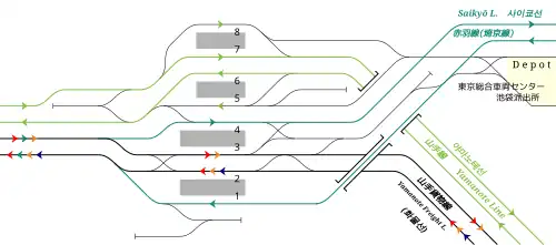 Der größte Teil wird vom Bahnhofsteil der JR East eingenommen. Er besteht aus acht Gleisen auf einem Viadukt, die an vier vollständig überdachten und mit Bahnsteigtüren ausgestatteten Mittelbahnsteigen liegen. Hier verkehren Züge der Saikyō-Linie und der Shōnan-Shinjuku-Linie (je ein Bahnsteig) sowie der Yamanote-Linie (zwei Bahnsteige). Bis in die frühen 1980er Jahre herrschte auf den Gleisen der Saikyō-Linie und der Shōnan-Shinjuku-Linie (1 bis 4) ein reger Güterverkehr, zumal diese damals noch keine Bahnsteige besaßen.
