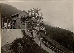 - ca. 1916 bis ca. 1921: Eine Materialseilbahn transportierte Erze zur Verladung hinauf zum Bahnhof.